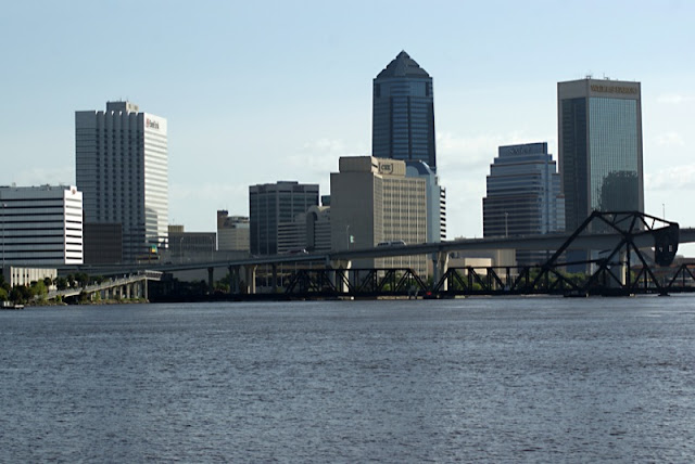 Looking towards downtown Jacksonville and the railroad bridge that can hold a boater hostage when it doesn't work.